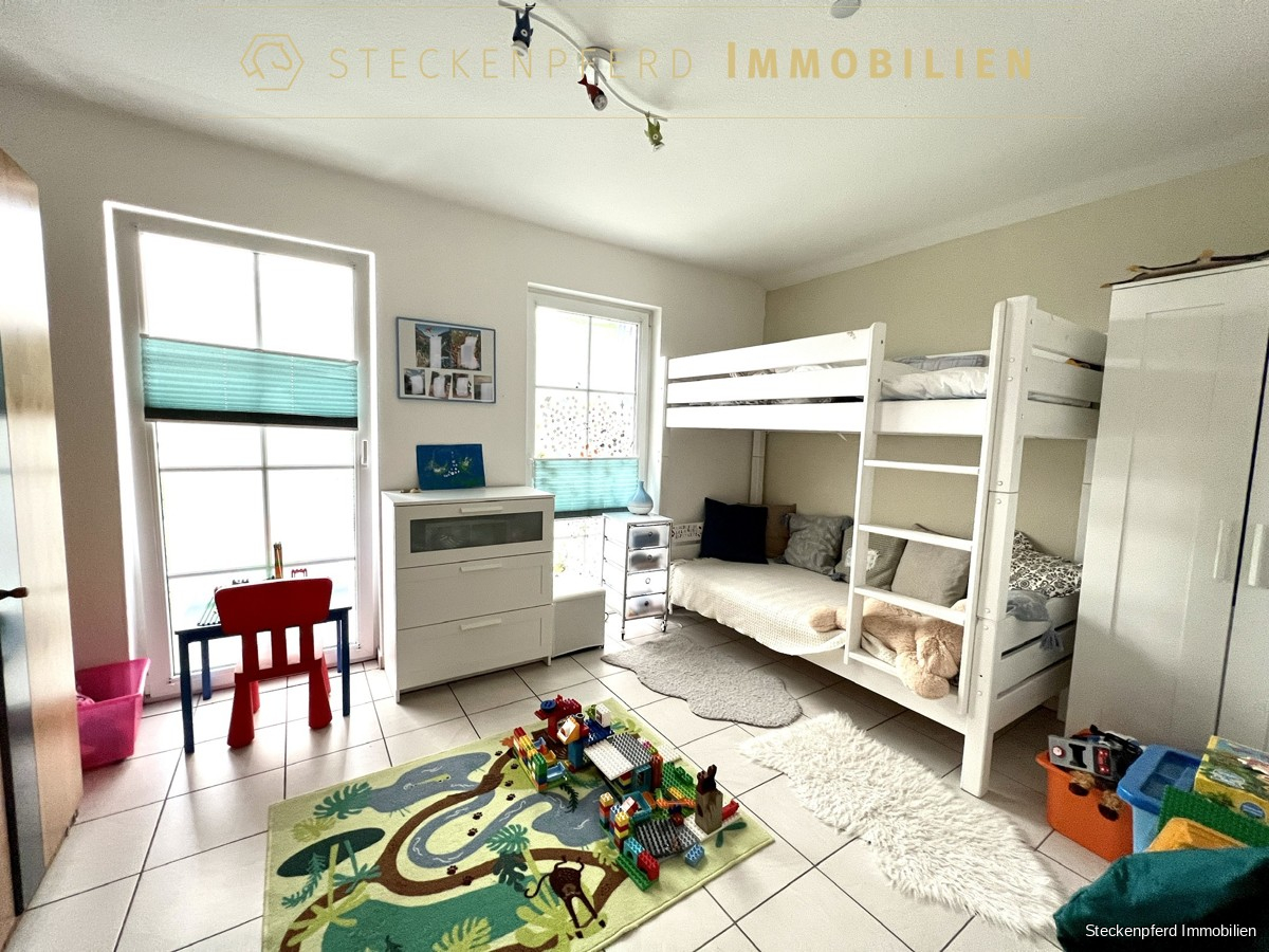 Die Obergeschosseinheit ist aktuell als Schlafetage genutzt und bietet mehrere Schlafzimmer sowie ein Badezimmer. Eine Küche ist hier nicht eingebaut, die Anschlüsse sind jedoch vorhanden – sodass bei Bedarf ein eigenständiger Haushalt eingerichtet werden kann. Für die Obergeschosseinheit besteht zudem die Möglichkeit, im Außenbereich eine separate Terrasse zu schaffen.