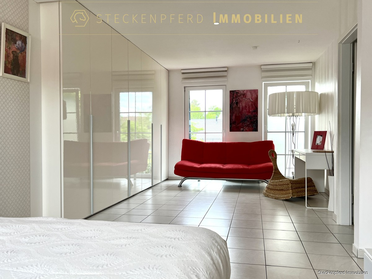 Im Kaufpreis enthalten sind die EBK der Marke Leicht, Möbel in beiden Bädern, die elektrische Markise mit Beleuchtung sowie maßgefertigte Einbauschränke im Schlafzimmer und in den Fluren.