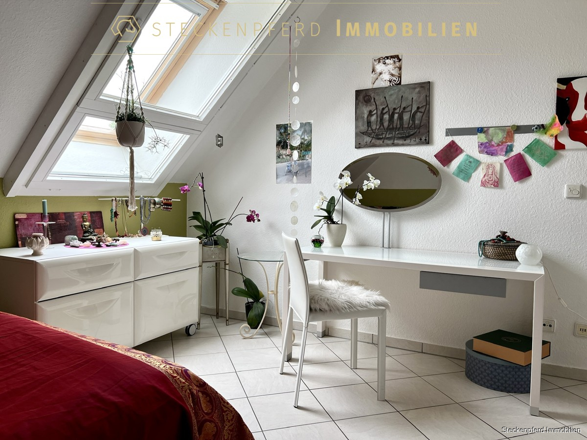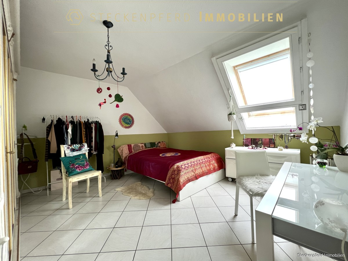 Die OG -Einheit ist aktuell als Schlafetage genutzt und bietet mehrere Schlafzimmer sowie ein Badezimmer. Eine Küche ist hier nicht eingebaut, die Anschlüsse sind jedoch vorhanden, sodass bei Bedarf ein eigenständiger Haushalt eingerichtet werden kann. Zudem besteht die Möglichkeit, im Außenbereich eine separate Terrasse zu schaffen. Ein gedämmter Spitzboden ergänzt das Platzangebot als praktischer Stauraum.