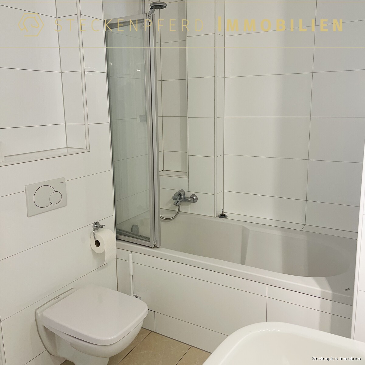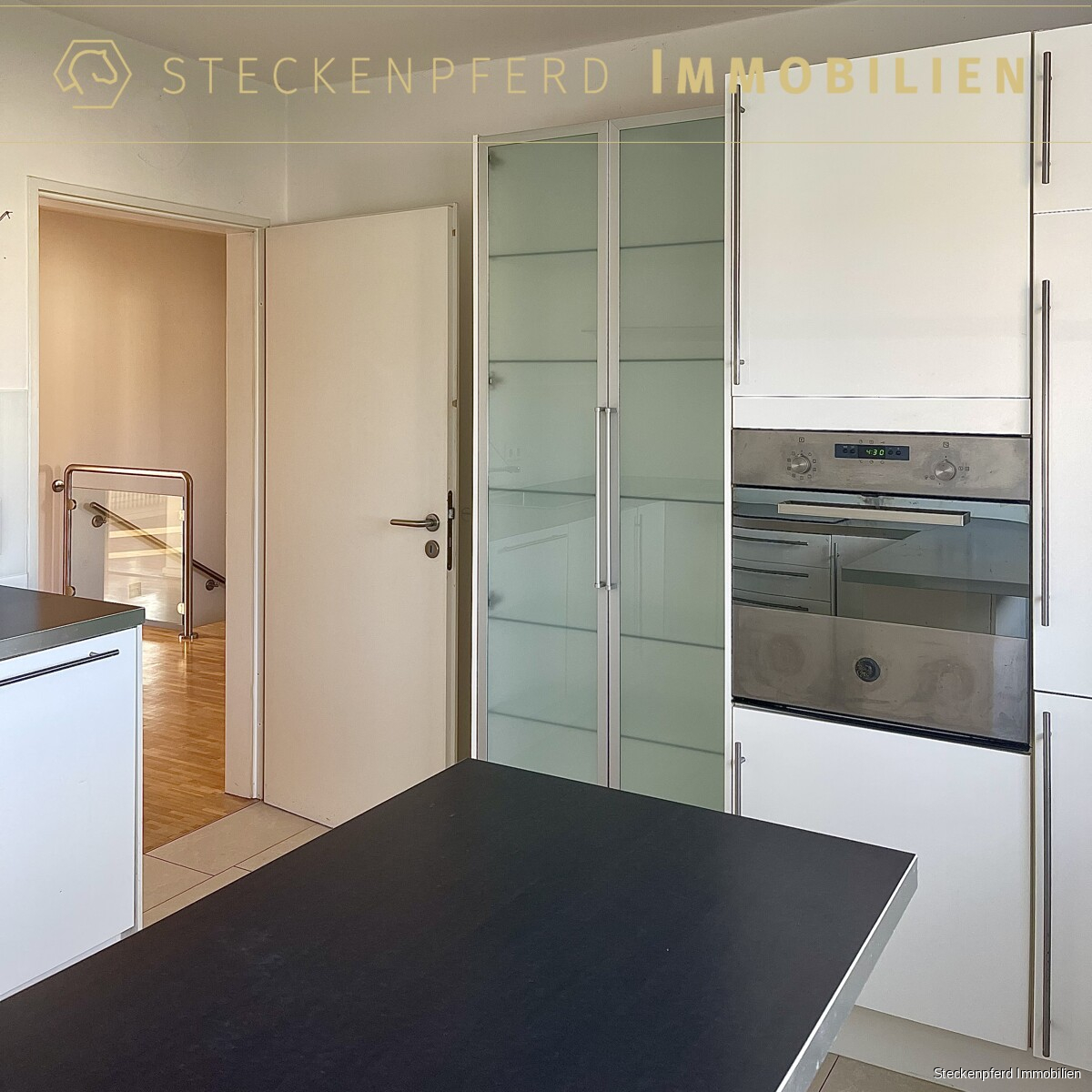 Die Wohnebene im OG umfasst außerdem eine großzügige Küche mit weißer EBK, ein neuwertiges Wannenbad sowie einen sonnigen Balkon. Parkett und großflächige Fenster unterstreichen das helle, freundliche Ambiente.