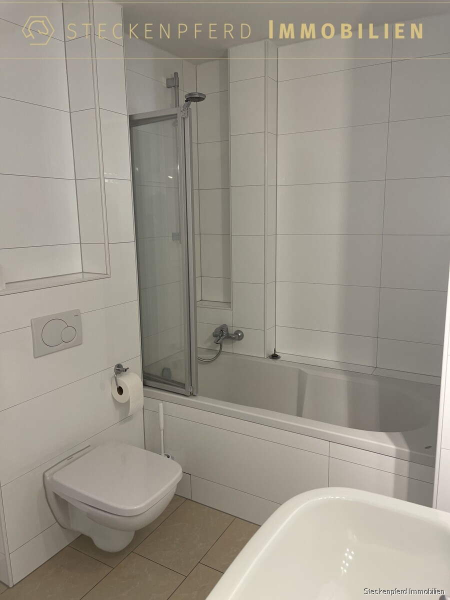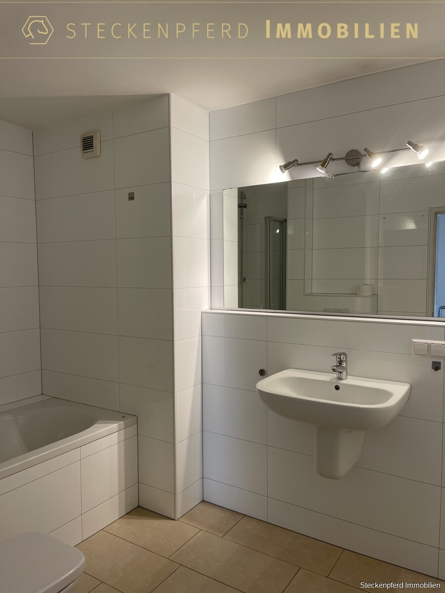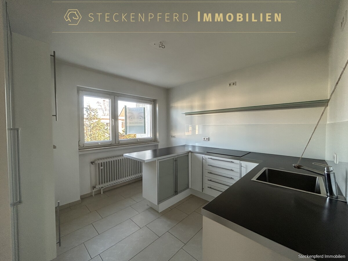 Die Wohnebene im OG umfasst außerdem eine großzügige Küche mit weißer EBK, ein neuwertiges Wannenbad sowie einen sonnigen Balkon. Parkett und großflächige Fenster unterstreichen das helle, freundliche Ambiente.